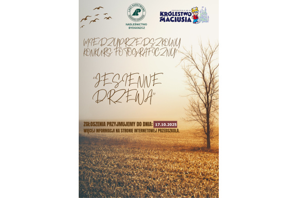 Przedszkole nr 80 "Królestwo Maciusia" w Bydgoszczy oraz Nadleśnictwo Bydgoszcz serdecznie zapraszają do udziału w konkursie fotograficznym ”Jesienne drzewa”. Zapraszamy dzieci (3, 4, 5, 6 – latki) z rodzicami.