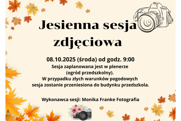 Informujemy, że jesienna sesja zdjęciowa odbędzie się 08.10.2025 (środa) od godz. 9:00. Sesja zaplanowana jest na terenie ogrodu przedszkolnego (plener).