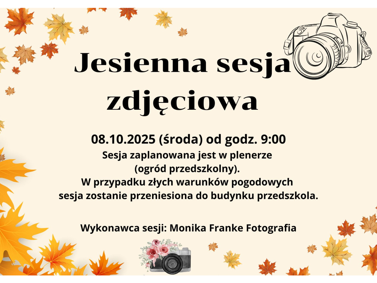 Informujemy, że jesienna sesja zdjęciowa odbędzie się 08.10.2025 (środa) od godz. 9:00. Sesja zaplanowana jest na terenie ogrodu przedszkolnego (plener).