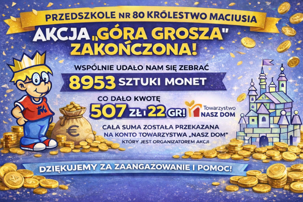 Z radością informujemy, że w naszym przedszkolu zakończyła się ogólnopolska akcja charytatywna „Góra Grosza”.