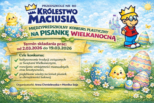 Przedszkole nr 80 „Królestwo Maciusia” zaprasza do udziału w międzyprzedszkolnym konkursie plastycznym pt. „Pisanka Wielkanocna”.