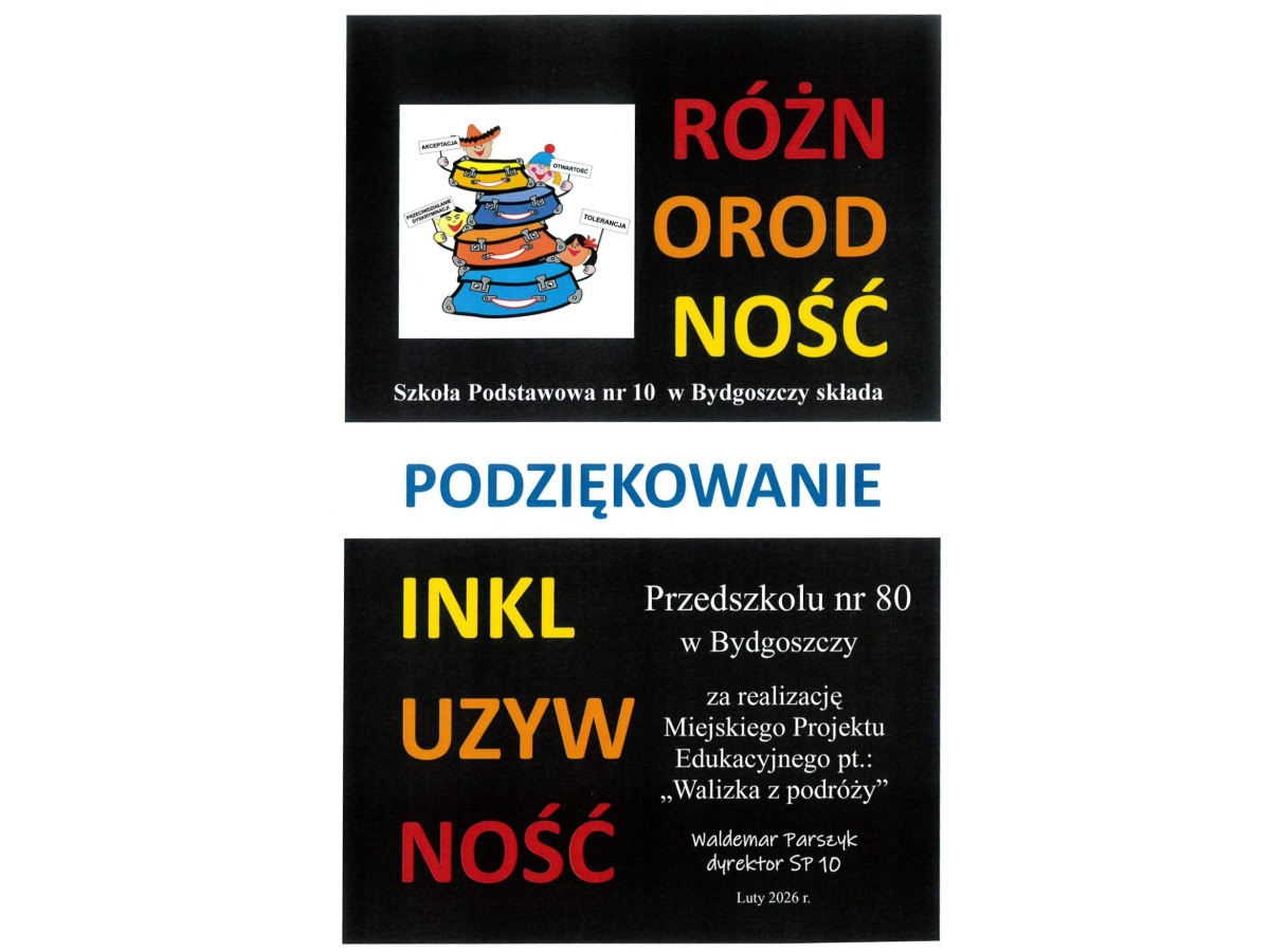Z radością informujemy, że Przedszkole nr 80 „Królestwo Maciusia” w Bydgoszczy otrzymało podziękowanie od Szkoły Podstawowej nr 10 w Bydgoszczy za udział w realizacji Miejskiego Projektu Edukacyjnego „Walizka z podróży”, poświęconego tematyce różnorodności i inkluzywności.