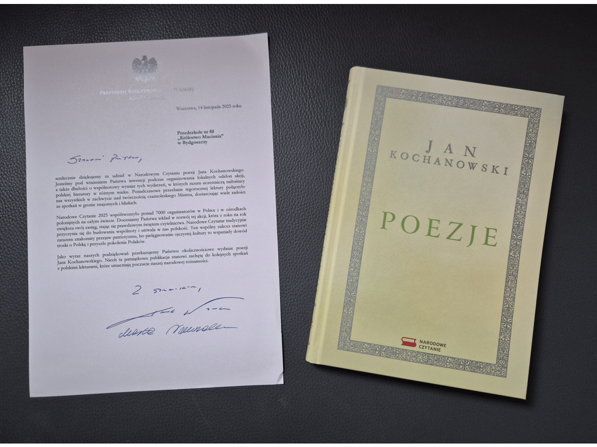 Przedszkole nr 80 „Królestwo Maciusia” w Bydgoszczy otrzymało oficjalne podziękowanie od Kancelarii Prezydenta Rzeczypospolitej Polskiej za zaangażowanie w tegoroczną edycję Narodowego Czytania. Placówka włączyła się w ogólnopolską akcję, której motywem przewodnim była twórczość Jana Kochanowskiego.