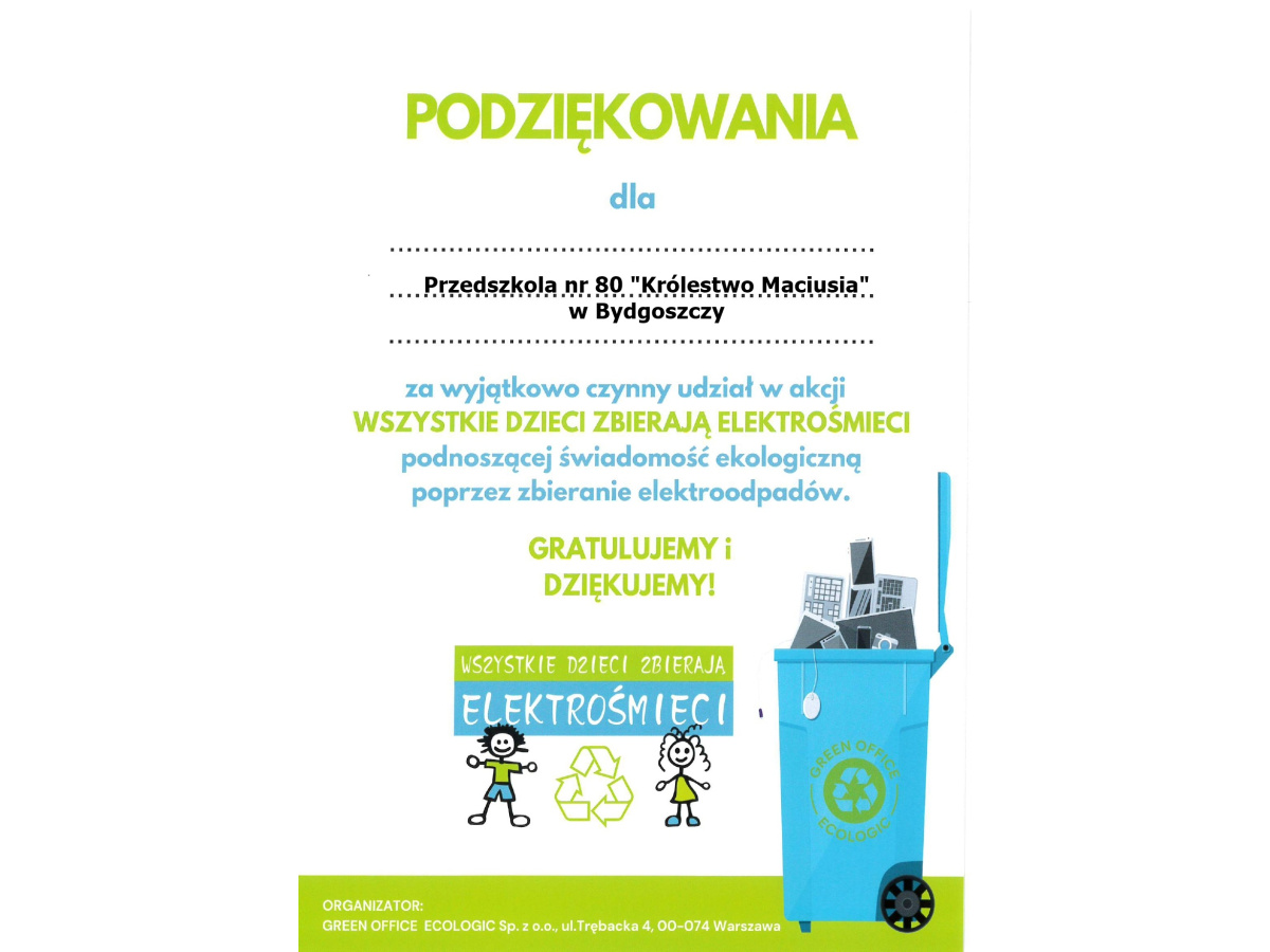 Przedszkole nr 80 „Królestwo Maciusia” z podziękowaniem za udział w akcji „Wszystkie dzieci zbierają elektrośmieci”