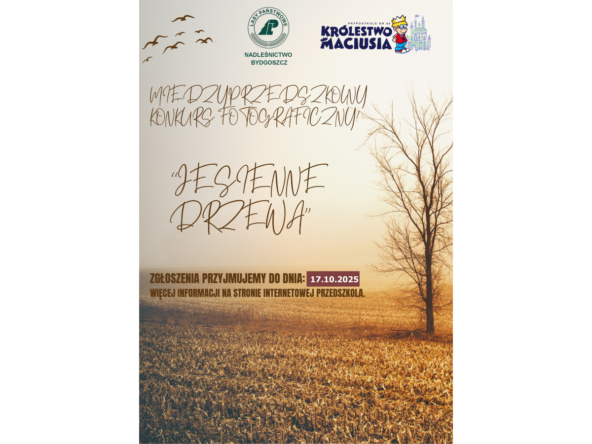 Przedszkole nr 80 "Królestwo Maciusia" w Bydgoszczy oraz Nadleśnictwo Bydgoszcz serdecznie zapraszają do udziału w konkursie fotograficznym ”Jesienne drzewa”. Zapraszamy dzieci (3, 4, 5, 6 – latki) z rodzicami. Szczegóły konkursu w regulaminie i na plakacie.