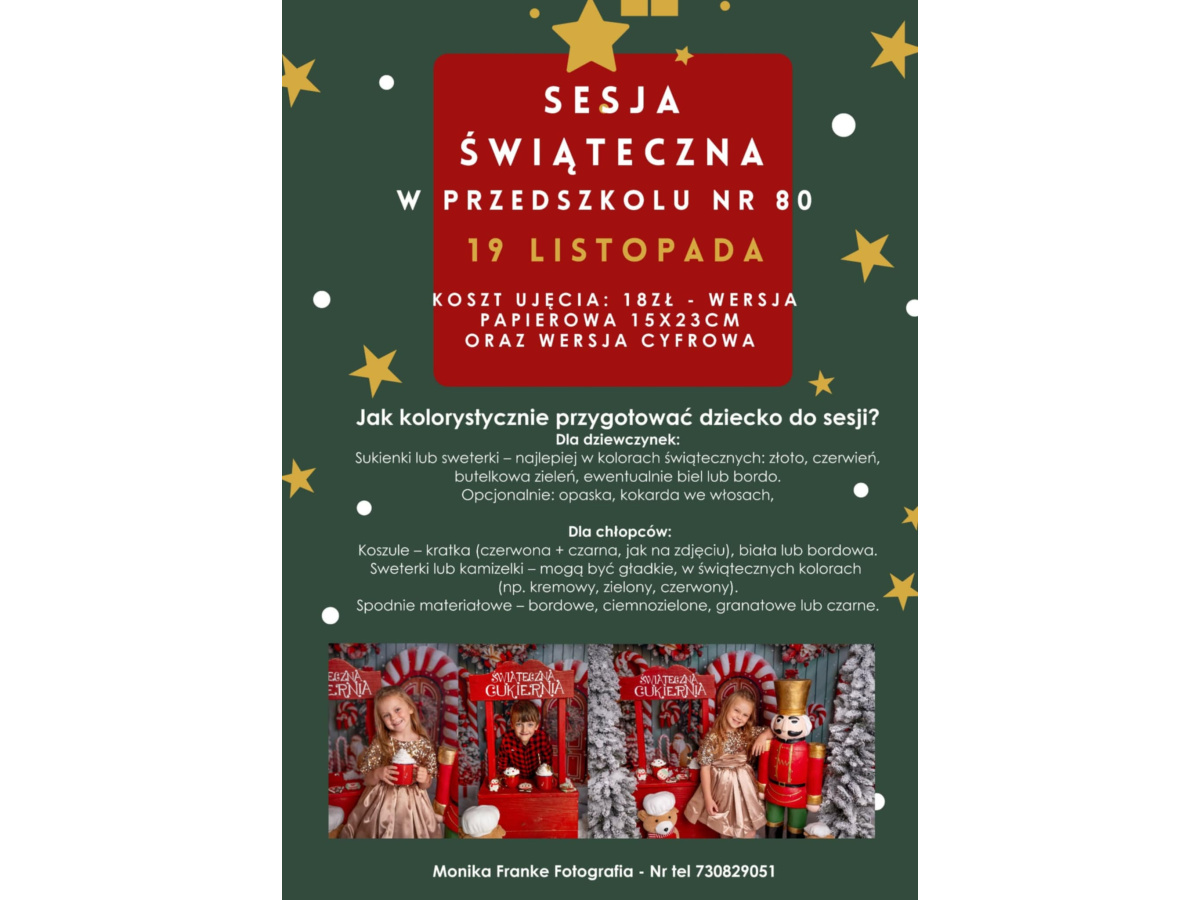 Szanowni Państwo,W najbliższą środę, 19 listopada 2025 r., odbędzie się świąteczna sesja fotograficzna.Szczegółowe informacje dotyczące kolorystyki i stylu sesji znajdują się na plakacie.Serdecznie zapraszamy do udziału!