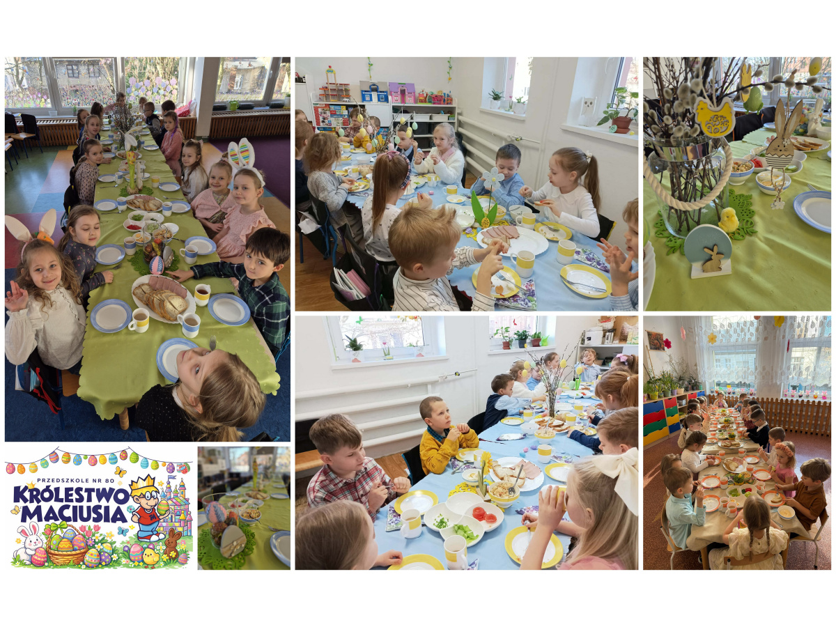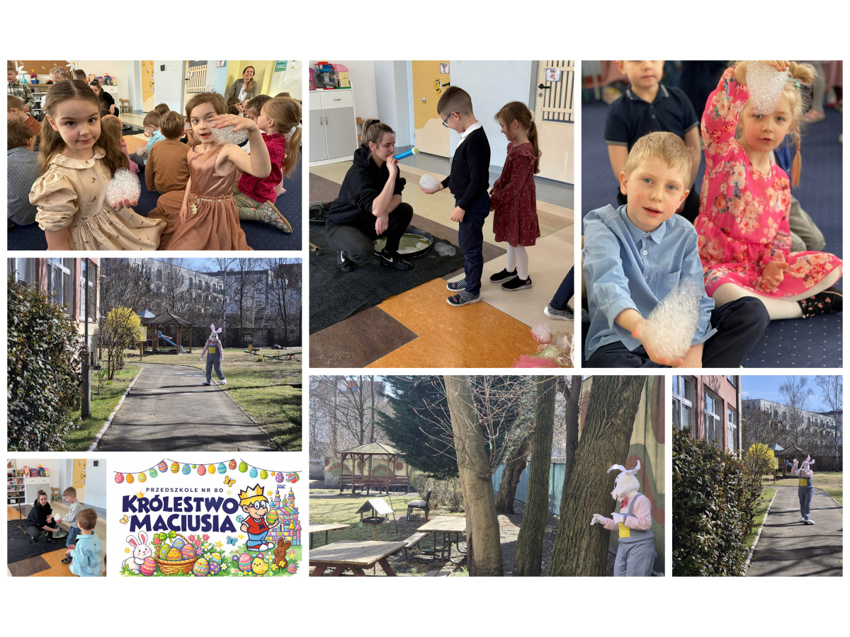Pierwsze dni kwietnia upłynęły w naszym przedszkolu w wyjątkowo radosnej i świątecznej atmosferze. 1 kwietnia w Przedszkolu nr 80 „Królestwo Maciusia” odbyło się uroczyste śniadanie wielkanocne. Dzieci zasiadły przy pięknie udekorowanych stołach, na których nie zabrakło tradycyjnych potraw i wiosennych ozdób. Był to czas pełen rozmów o świątecznych zwyczajach, dzielenia się radością oraz wspólnego celebrowania nadchodzącej Wielkanocy. Tego dnia na przedszkolaków czekało również wiele atrakcji. Ogromne emocje wzbudził wiosenny pokaz baniek mydlanych, który zachwycił dzieci kolorami i niezwykłymi kształtami unoszącymi się w powietrzu. Nie zabrakło także sesji fotograficznej, podczas której dzieci mogły uwiecznić te wyjątkowe chwile w świątecznej scenerii. Największą niespodzianką była jednak wizyta Zajączka Wielkanocnego, który odwiedził nasze przedszkole i… zostawił dla dzieci prezenty! Upominki zostały ufundowane przez Radę Rodziców, za co składamy serdeczne podziękowania. Radość i uśmiechy dzieci były najlepszym dowodem na to, jak wiele znaczył ten gest.
